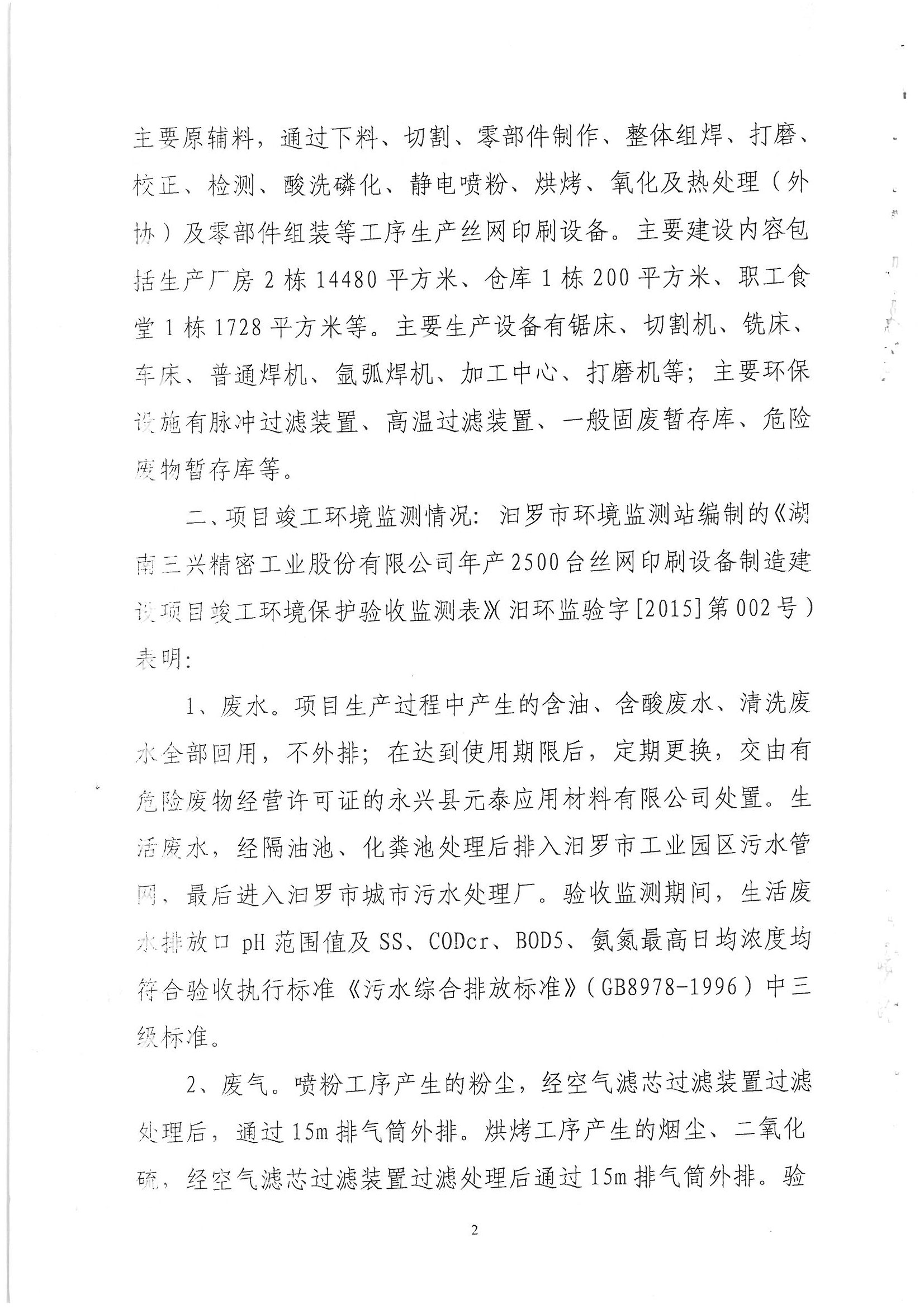 三兴丝网印刷设备制造建设项目验收批复