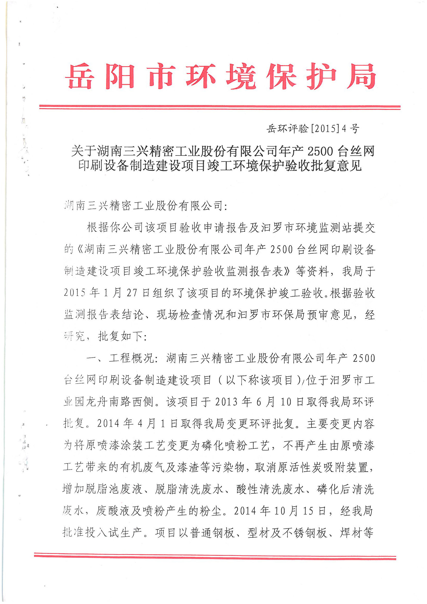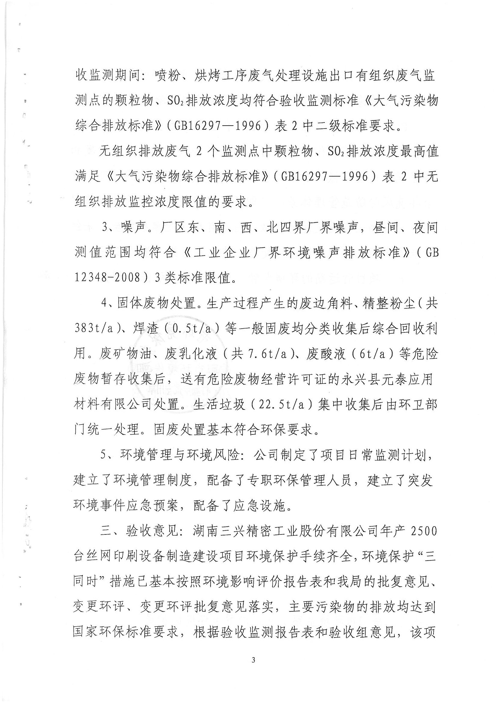 三兴丝网印刷设备制造建设项目验收批复